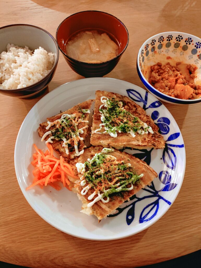 お好み焼き + 納豆 + キムチ + ごはん + 味噌汁