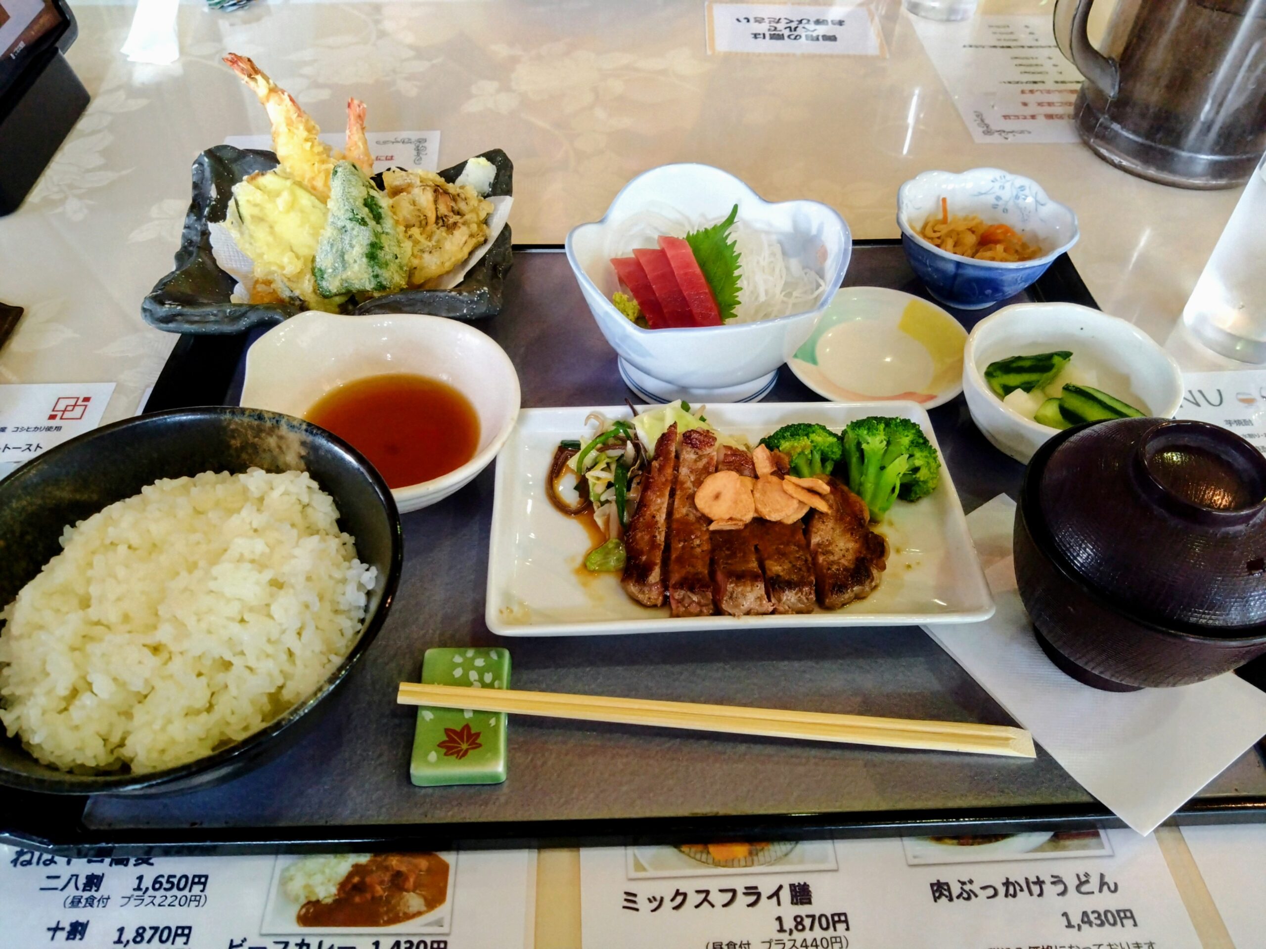 ステーキ、刺身、天麩羅と大人のお子様ランチ。