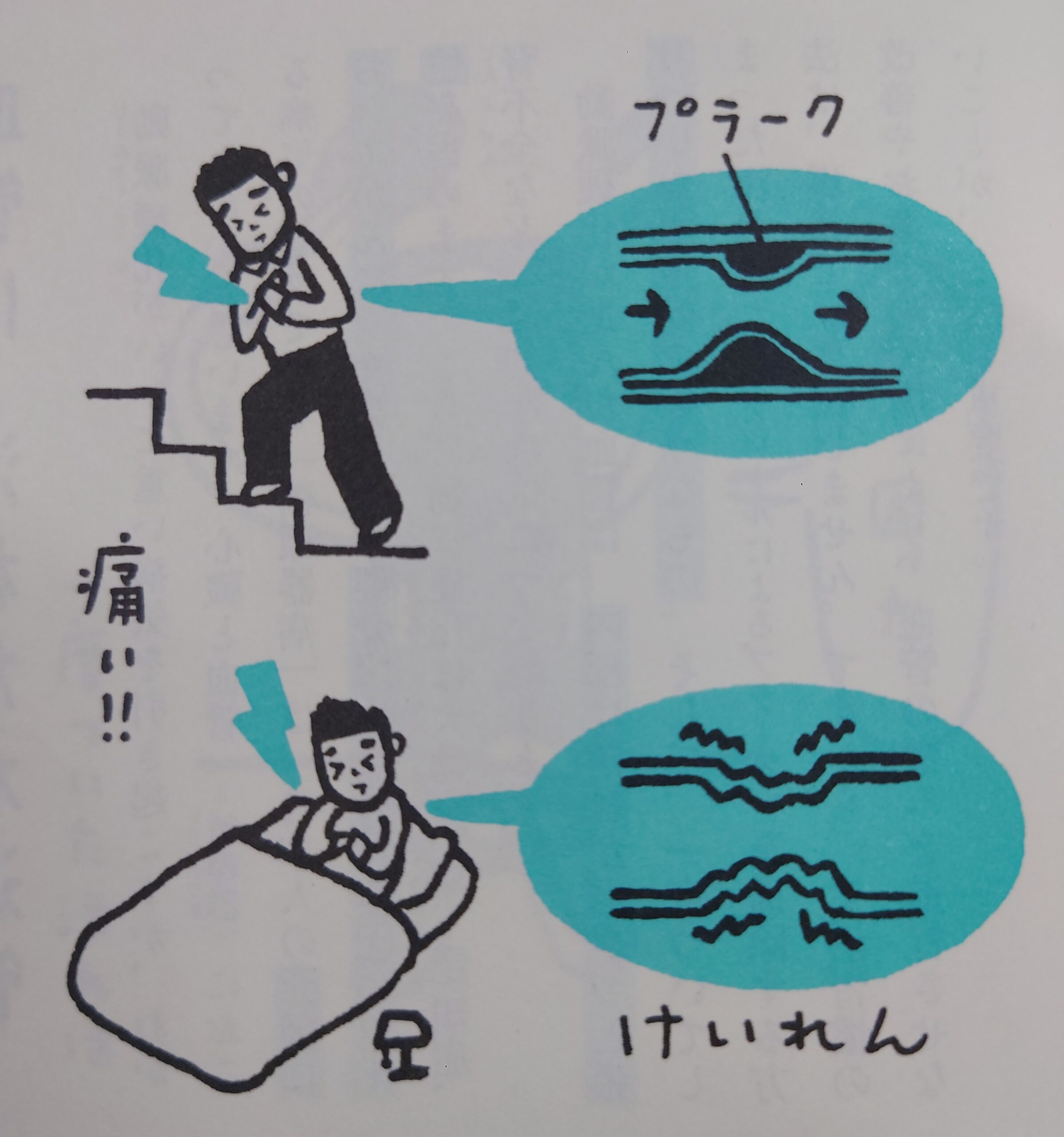 またタイミングが異なり、労作性狭心症は運動時、 冠攣縮性狭心症は安静時(特に早朝や喫煙・飲酒後)、