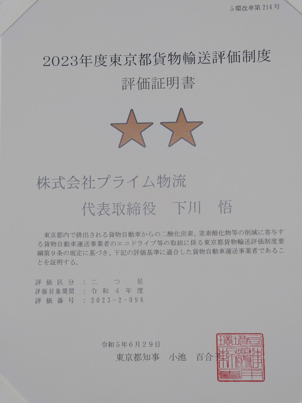 ■ 2023年度貨物輸送評価制度 評価証明書 1部