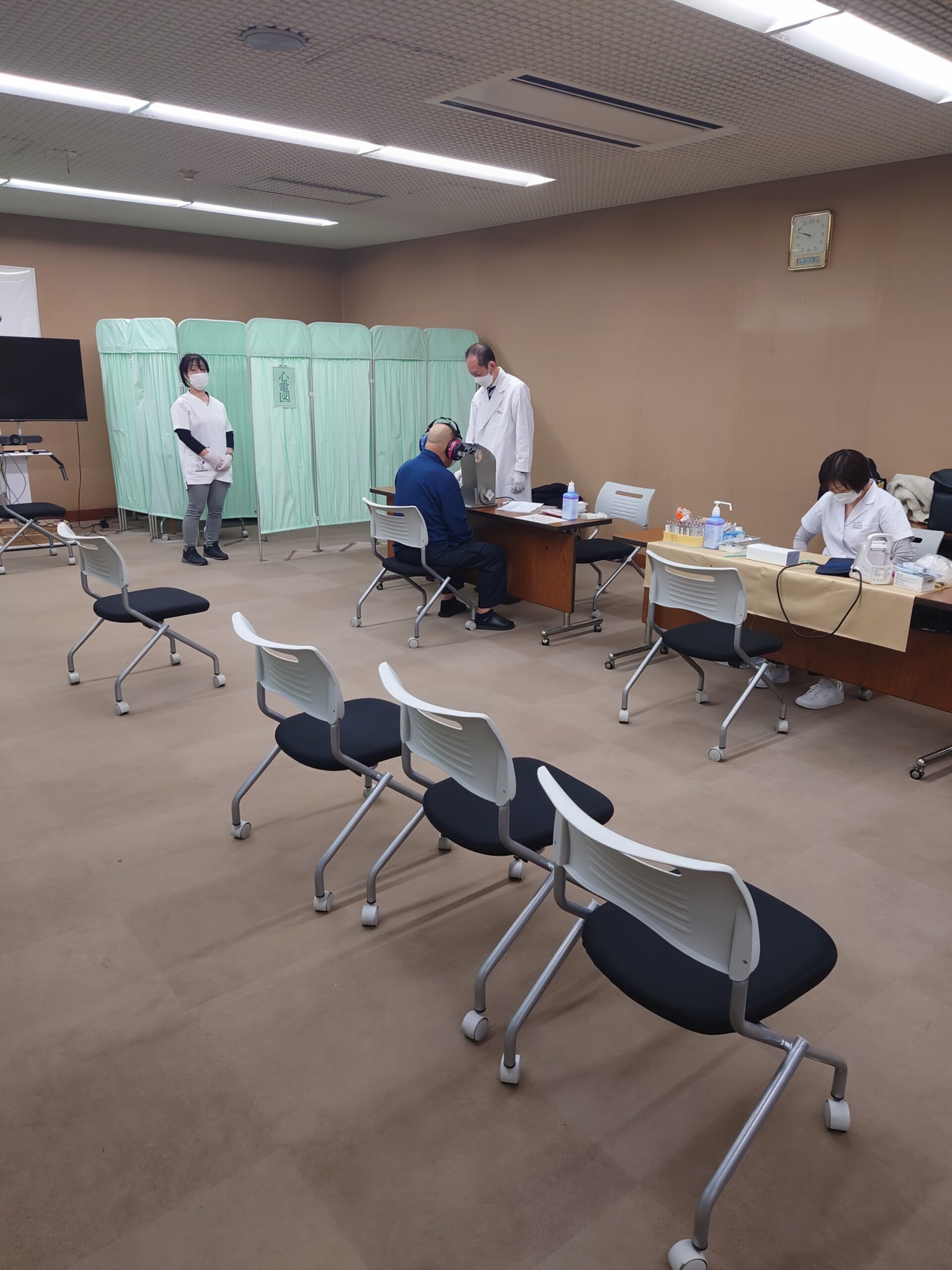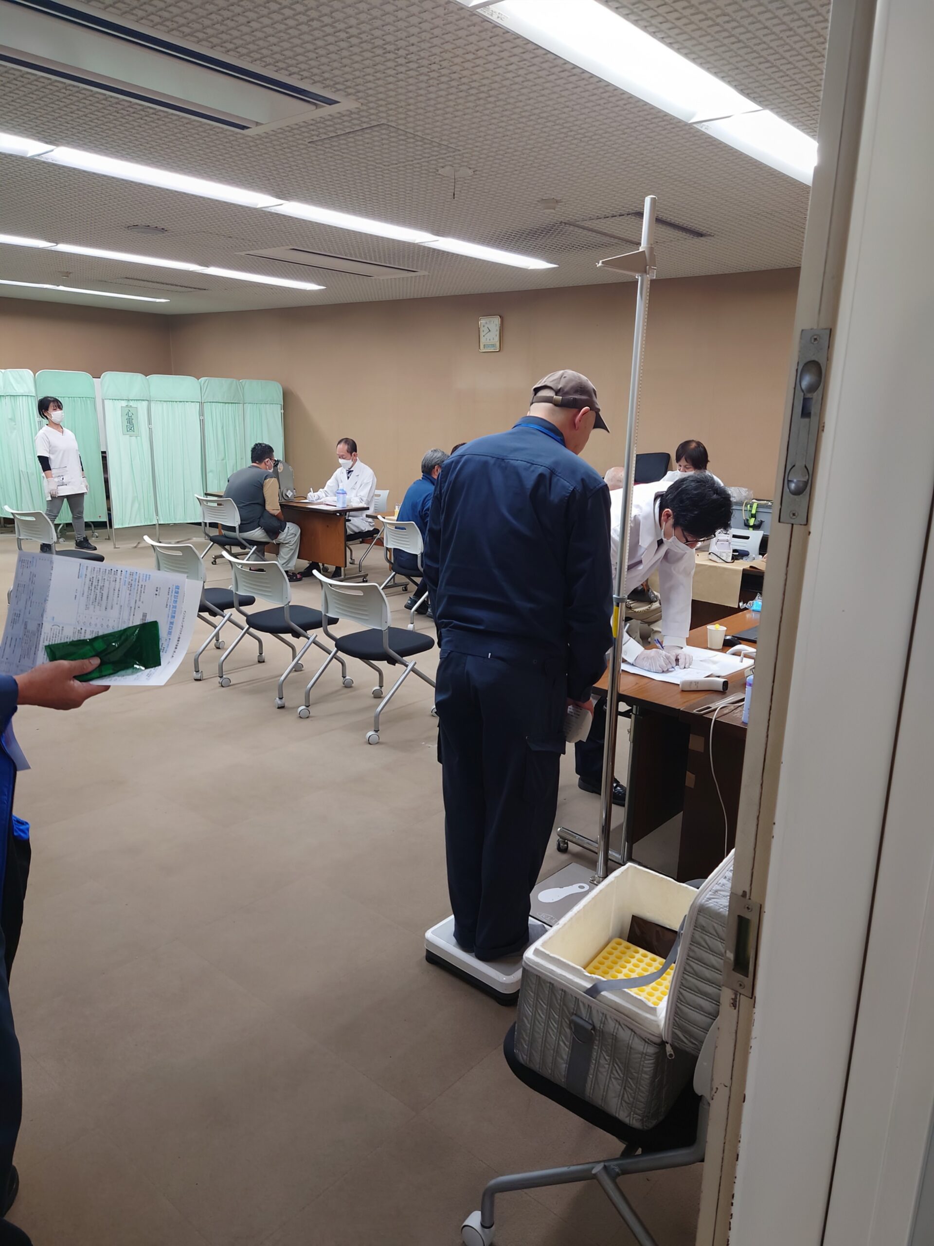 身長、体重、BMI、腹囲、血圧、視力、聴力、胸部レントゲン、心電図、血液検査、胃部X線検査、便潜血反応検査など、さまざまな検査を受ける社員の皆さん、昨夜から飲食を控えてお疲れ様でした。